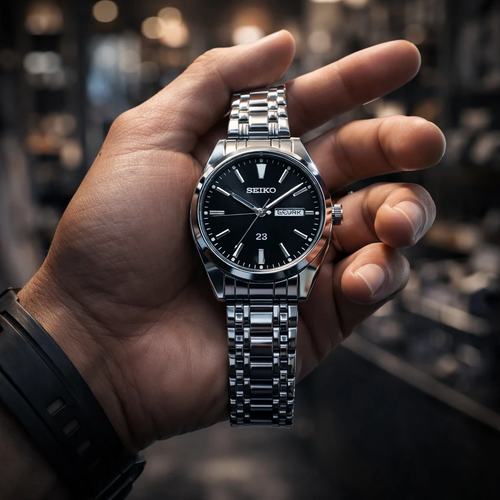 ساعت مچی مردانه سیکو مدل Seiko SQ Quartz Day‑Date بند استیل صفحه مشکی