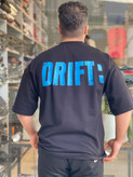 چاپ DRIFT: در جلو با ابعاد مینیمال و در پشت با تایپوگرافی بزرگ و جسور، تضاد رنگ آبی روی زمینه مشکی، جلوهای مدرن و پرانرژی ایجاد میکند.