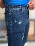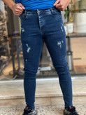 شلوار جین اسکینی آبی با زاپهای شهری، طراحی شده برای استایلهای روزمره اسپرت و استریت. شست آبی متوسط رو به تیره در کنار سایشها و زاپهای کنترلشده، ظاهری پرانرژی و امروزی ایجاد کرده بدون آنکه از حالت شلوغ یا اغراقشده خارج شود.