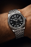 ترکیب قاب نقرهای براق با صفحهی مشکی بافتدار، دقیقاً همان چیزیست که حس قدرت، دقت و وقار را منتقل میکند. این ساعت طوری طراحی شده که هم در نور کم و هم در نور روز، کاملاً چشمگیر باشد.