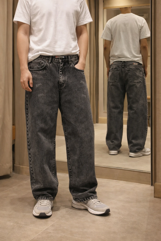 نیمبگ واقعی با رنگ ذغالی تیره و دیسترس ملایم؛ مناسب استایل استریتور، روزمره و ستهای مینیمال. فرم آزاد در ران و زانو برای راحتی بالا، در عین حفظ ظاهر مرتب و ترندی.