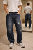 شلوار جین نیمبگ مردانه با رنگ آبی تیره Stone Wash، مناسب استایلهای خیابانی و استفاده روزمره با راحتی بالا.