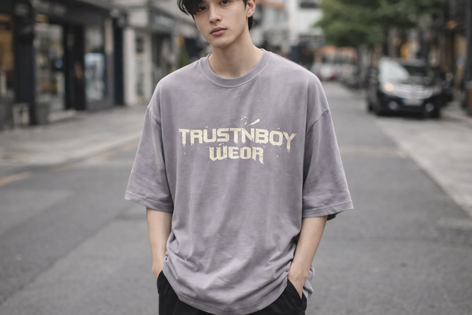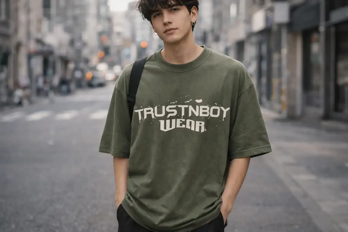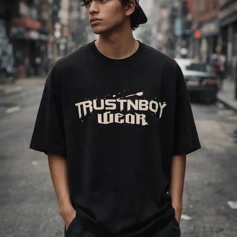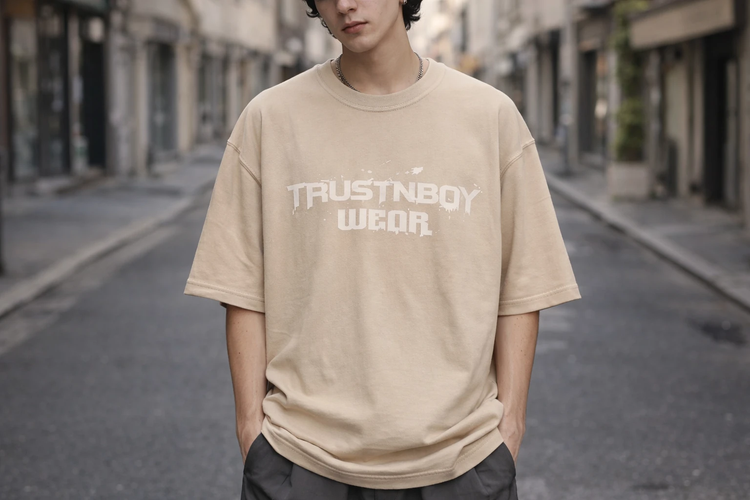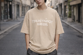 تی شرت مردانه باکسی چاپ جلو گرم بالا ماکان مدل TRUSTNBOY رنگ بندی