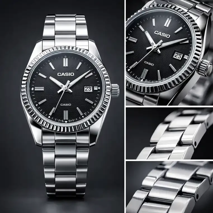 صفحه مشکی با نشانگرهای ساده و خوانا طراحی شده است. عقربههای فلزی به راحتی روی پسزمینه تیره دیده میشوند و نمایشگر تاریخ در سمت راست صفحه قرار دارد. این طراحی ساده باعث میشود ساعت در نگاه اول واضح و قابل خواندن باشد.